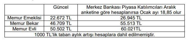 Buradaki %12,43 enflasyon verisine toplu sözleşme zammını da eklediğimiz taktirde memur ve memur emeklilerine %18,85 oranında maaş farkı çıkacaktır. Tabi bir de bunun üzerine toplu sözleşmede verilen 1000 TL’lik taban aylık artışı da maaşlara ilave edilecektir.