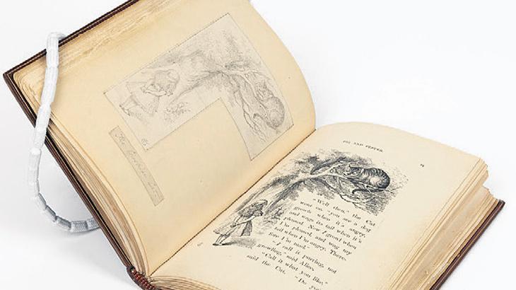 1865 tarihli ilk baskıdan kalan bu nadir kitap, Carroll’ın el yazısı notlarını ve İngiliz karikatürist John Tenniel’e ait özgün çizimleri içeriyor.