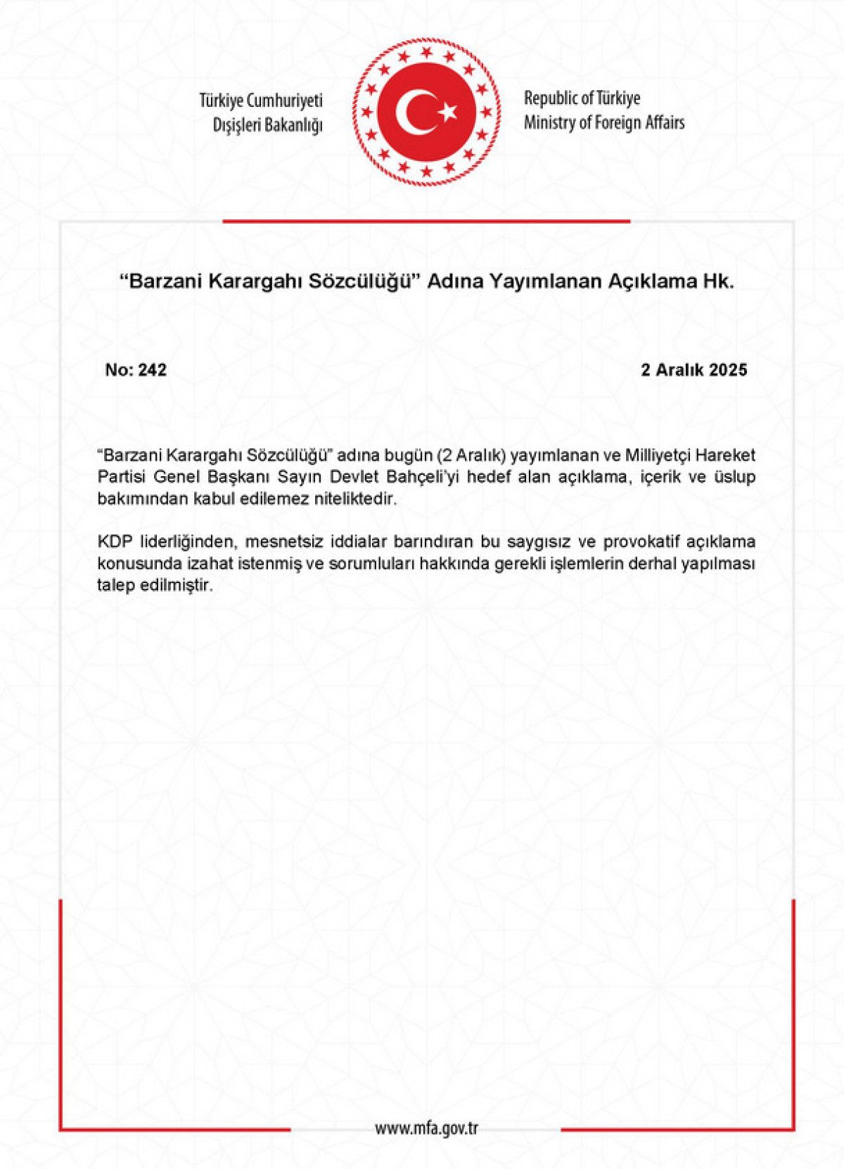 Dışişleri Bakanlığı, KDP’ye bağlı “Barzani Karargahı Sözcülüğü”nün Milliyetçi Hareket Partisi Genel Başkanı Devlet Bahçeli’yi hedef alan açıklamasına sert tepki gösterdi.