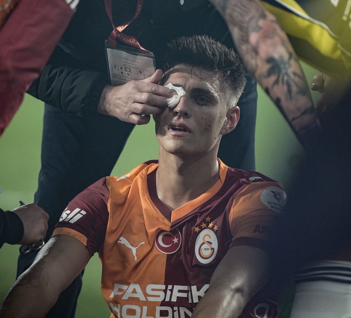 Sarı-Kırmızılı takımın X hesabından “Yüzündeki yara, alnımızın akıdır!” ifadeleri kullanılarak Kazımcan’ın fotoğrafı paylaşıldı.