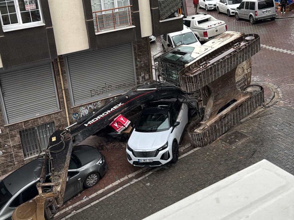 İstanbul’un Esenyurt ilçesi Pınar Mahallesi’nde tır dorsesinde taşınan iş makinesi park halindeki araçların üzerine devrildi.