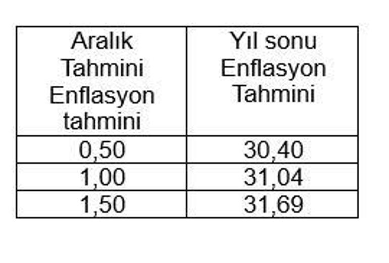 Eğer aralık ayı enflasyonu %0.50 çıkarsa yıl sonu enflasyonu %30.40 olacaktır. Aralık ayı enflasyonu %1.00 olarak açıklanırsa yıl sonu enflasyonu %31.04 olur.