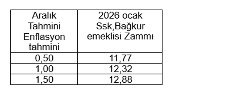 Aralık ayı enflasyonu %1.00 olarak gerçekleşirse SSK ve Bağkur emeklilerine zam oranı %12.32 olur. Aralıkta aylık enflasyon %1.50 olursa SSK ve Bağkur emeklilerinin yeni yıl zammı %12.88 olarak gerçekleşir.