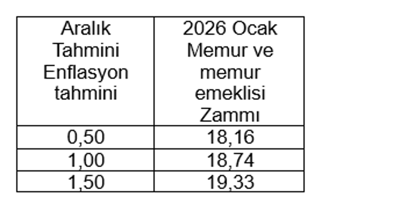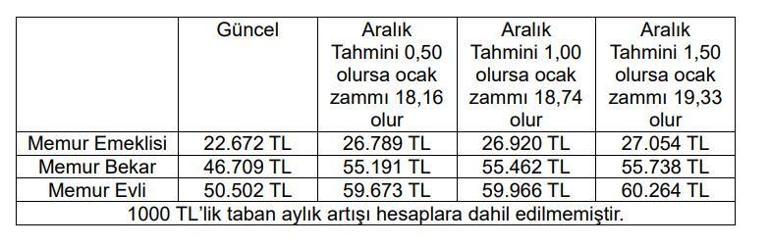 Eğer aralık ayı enflasyonu %0.50 olursa memur ve memur emeklilerinin maaş zammı %18.16 olur. Aralık ayı enflasyonu %1.00 olursa memur ve memur emeklilerinin zam oranı %18.74 olur. Aralıkta aylık enflasyon %1.50 seviyesinde gelirse memur ve memur emeklilerinin yeni yıl zammı %19.33 olur.