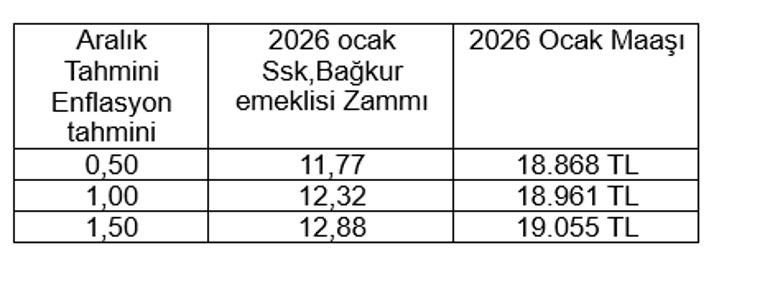 Bilindiği üzere SSK ve Bağkur emeklilerine yılda iki kez maaş farkı verilmektedir. Temmuz ayından kasım ayına kadar kesinleşen %12.21’lik enflasyon verisine aralık ayı için 3 farklı senaryoyu eklediğimizde maaş zammı için karşımıza şu oranlar çıkacaktır. Aralık ayı enflasyonu %0.50 çıkarsa SSK ve Bağkur emeklisinin 2026 yılı Ocak ayı zammı %11.77 olacaktır.