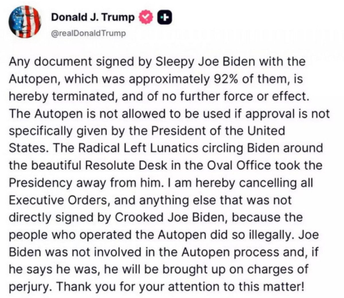ABD Başkanı Donald Trump, kendi sosyal medya platformu Truth Social üzerinden yaptığı açıklamada, eski Başkan Joe Biden yönetimini hedef alarak, Autopen (otomatik imza) ile imzalanan tüm başkanlık belgelerini geçersiz kıldığını açıkladı.