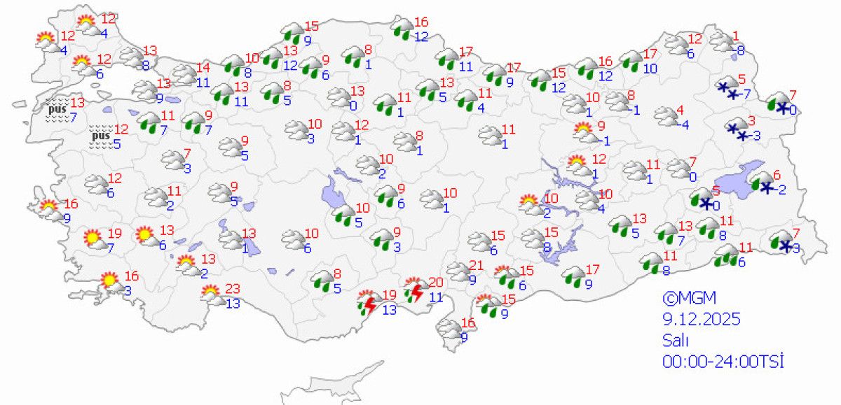 İç Anadolu’da hafif yağmurlar devam ederken, Doğu Anadolu’nun batısında karla karışık yağmur görüleceği tahmin ediliyor.