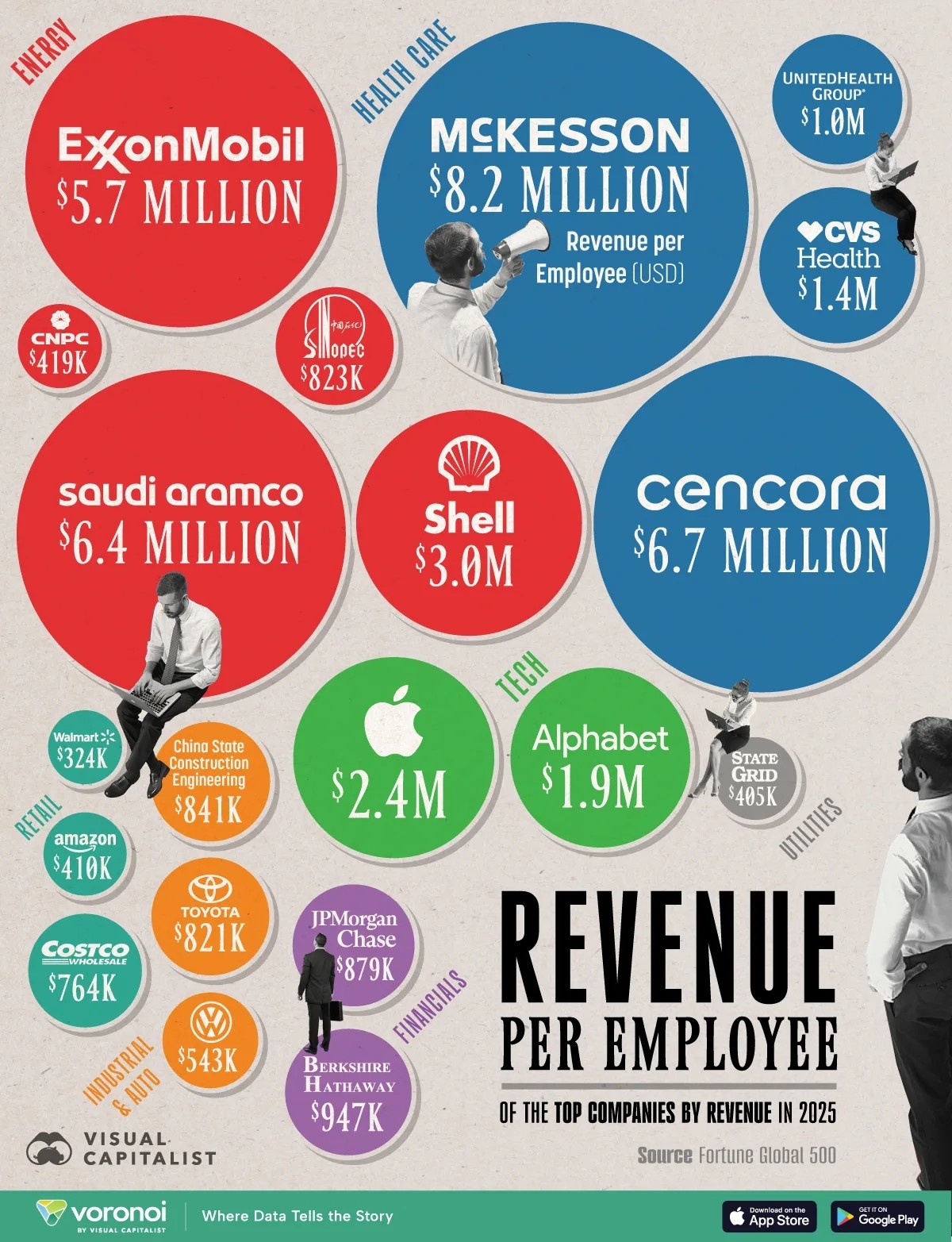 Bu rakamlar, diğer büyük şirketlerin çalışan başına gelirlerini neredeyse ikiye katlıyor. Visual Capitalist’in verilerine göre, çalışan başına gelirde lider olan McKesson bile çalışan başına yalnızca 8,2 milyon dolar üretebiliyor. Teknoloji şirketlerinde bu rakam daha da düşük: Apple çalışan başına 2,4 milyon dolar, Alphabet (Google) ise 1,9 milyon dolar gelir elde ediyor.